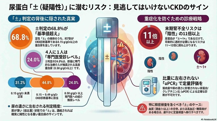 臨床現場において「正常範囲内」として看過されることも少なくないが、近年の疫学研究および臨床統計データは、この±判定の中に少なからぬ割合で 0.15 \text{ g/gCr} 以上の有意な蛋白尿が隠れていることを示唆しています。